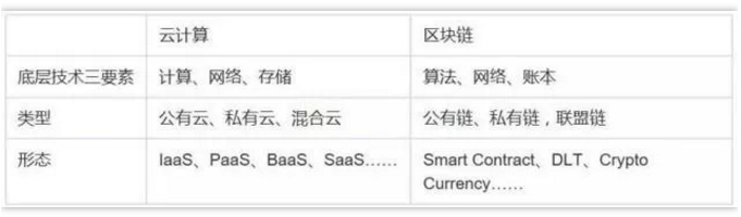 云计算,是一种根据互联网服务使用量来付费的一种模式;区块链,是去中心化的数据库账本,建立一种数据加密、不被篡改伪造的信任体制。在底层技术三要素、类型和形态上,二者有很大的相似之处。